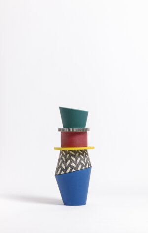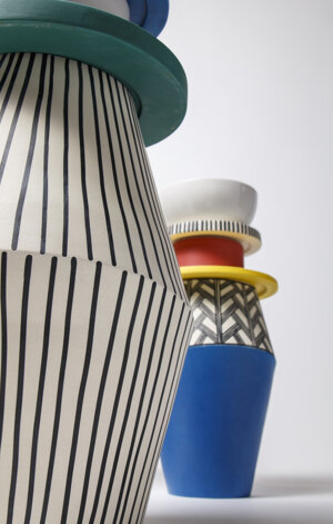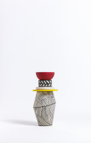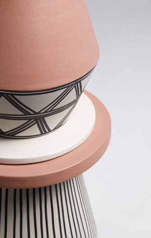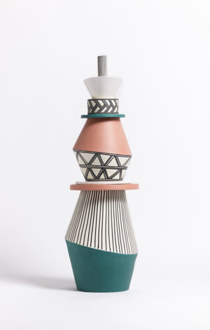 The vases are entirely handmade in Italy and their shapes, finishes and colors are inspired by the aesthetics and body paintings of Indigenous peoples. The different elements of the totem can be combined as desired to create a new and personalized composition every time.
