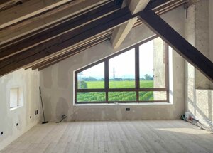 The new workshop is the result of a careful conservation restoration, designed to respect the history of the building and the surrounding landscape: fields, vineyards, and open views toward the Friulian mountains.